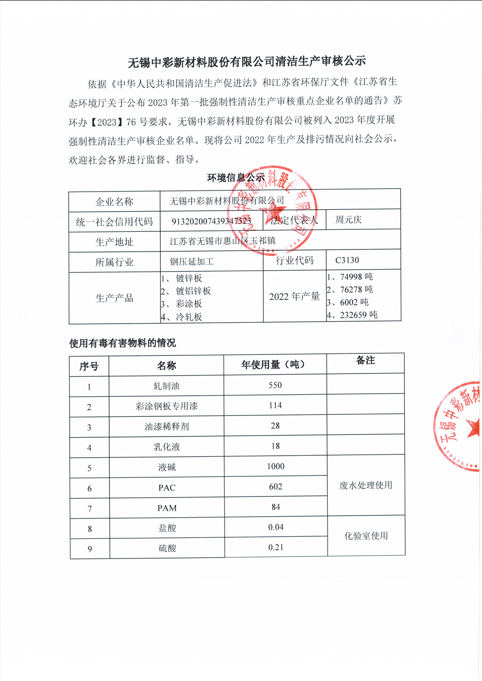 無錫中彩新材料股份有限公司被列入2023年度開展強(qiáng)制性清潔生產(chǎn)審核企業(yè)名單?,F(xiàn)將公司2022年生產(chǎn)及排污情況向社會公示,歡迎社會各界進(jìn)行監(jiān)督、指導(dǎo)。